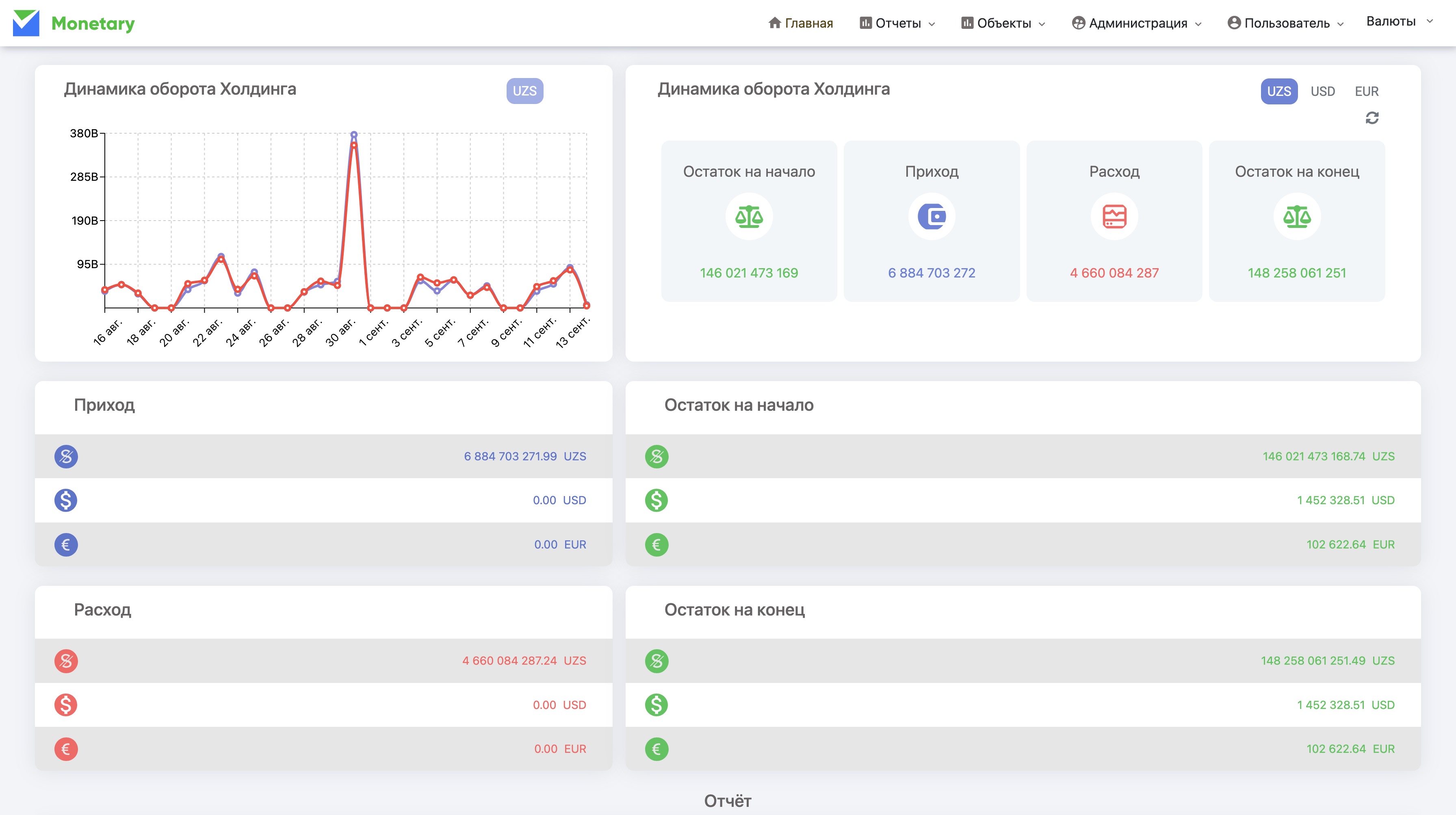 Табло где отображается сумма оборотов денежных средств по всем расчетным счетам в реальном режиме (актуальность 2 мин), разделяя их по видам валюты. Каждому пользователю отображается в рамках его доступа к счетам подразделения